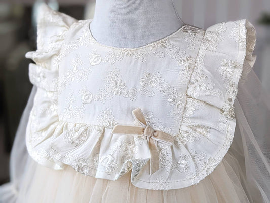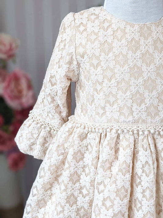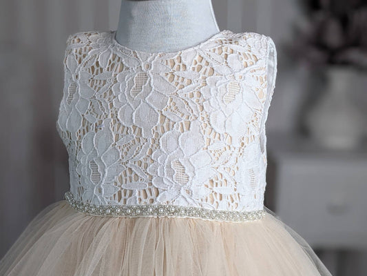 Bež haljina od sjajne bež čipke i tila
