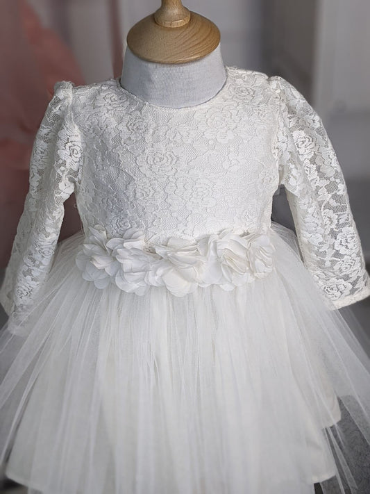 Bela haljina sa cvetnim reljefnim belim materijalom u gornjem delu