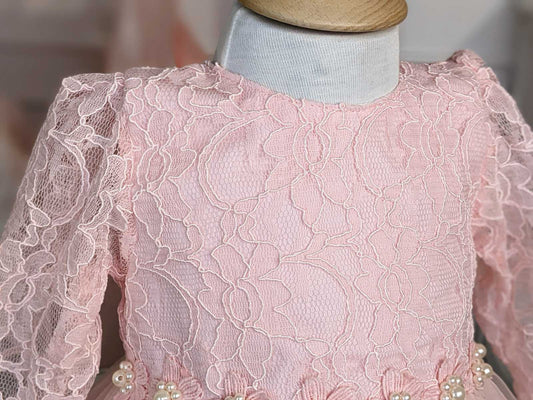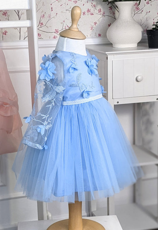 Plava haljina od 3d čipke i tila sa dugim rukavima
