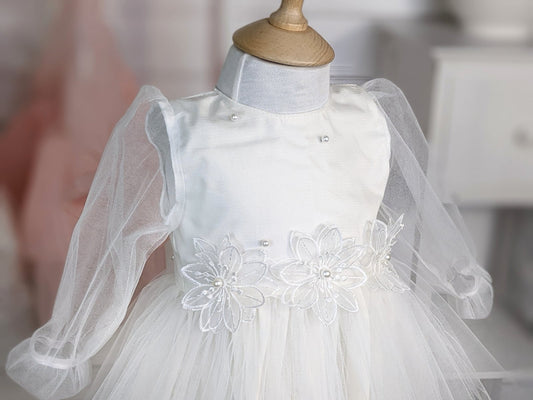 Bela haljina sa biserima u gornjem delu i cvetovima na struku