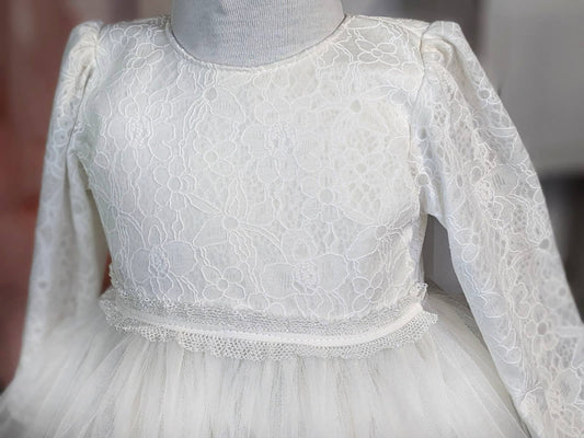 Bela haljina sa tufnama u gornjem delu i biserima na struku