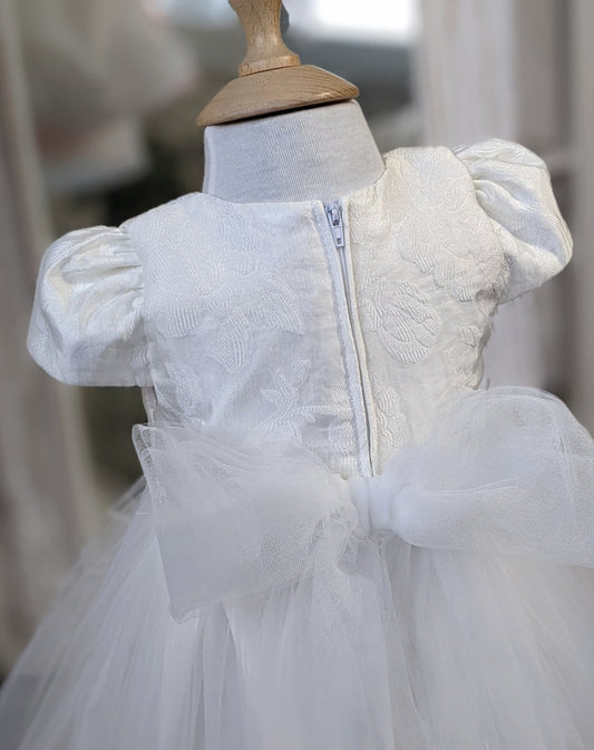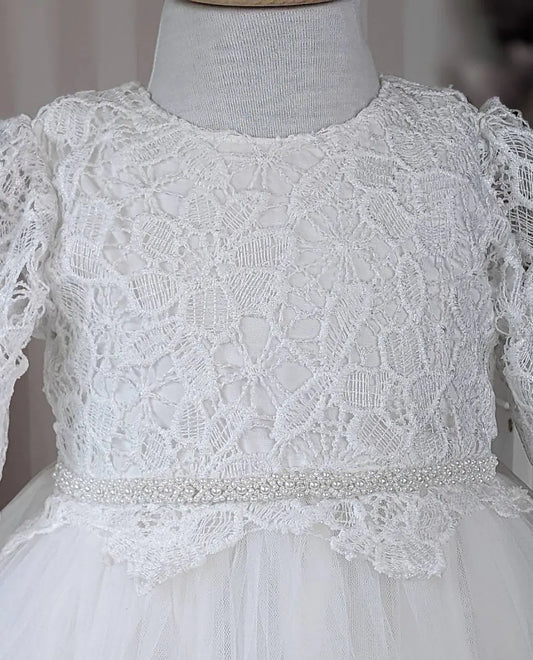 Bela maxi haljina od čipke i tila sa 3/4 rukavima