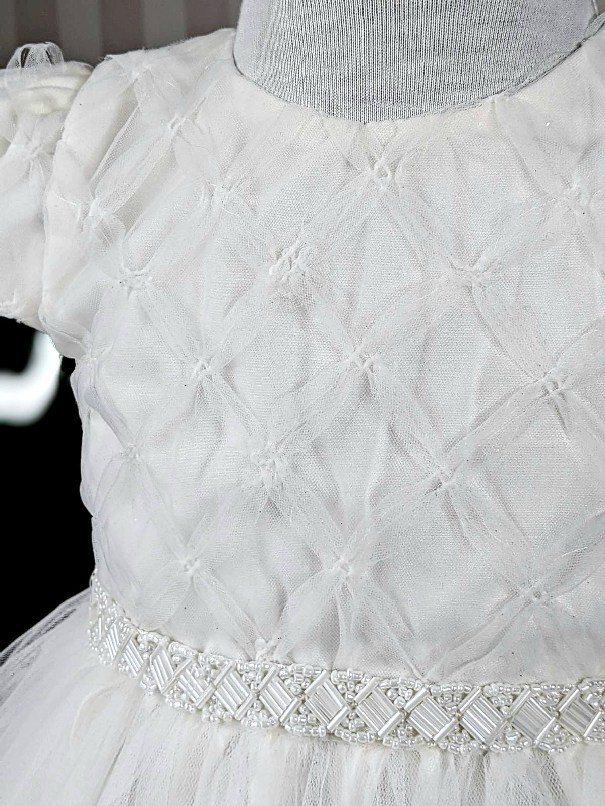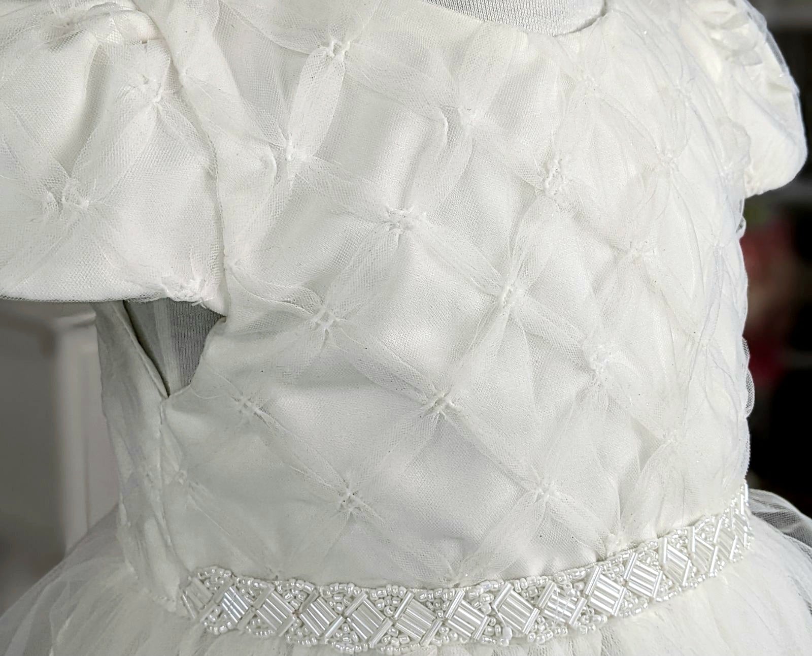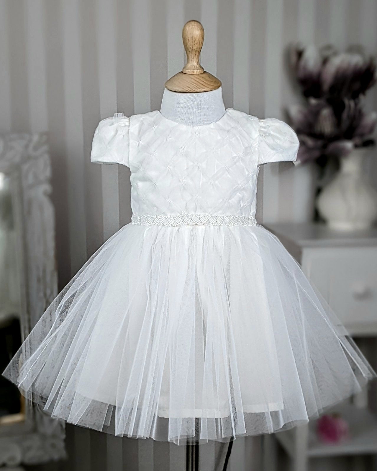 U gornjem delu haljine je til formiran u efektne 3d rombove. Pozadi je dugačak rajfešlus. Ispod tila u gornjem delu haljine i tila u donjem delu haljine je pamučni materijal. U prilogu je Vodič za veličine gde možete proveriti obim struka i dužinu haljine i tako izabrati odgovarajući broj. Klikom na izabranu veličinu dobijete cenu za taj broj