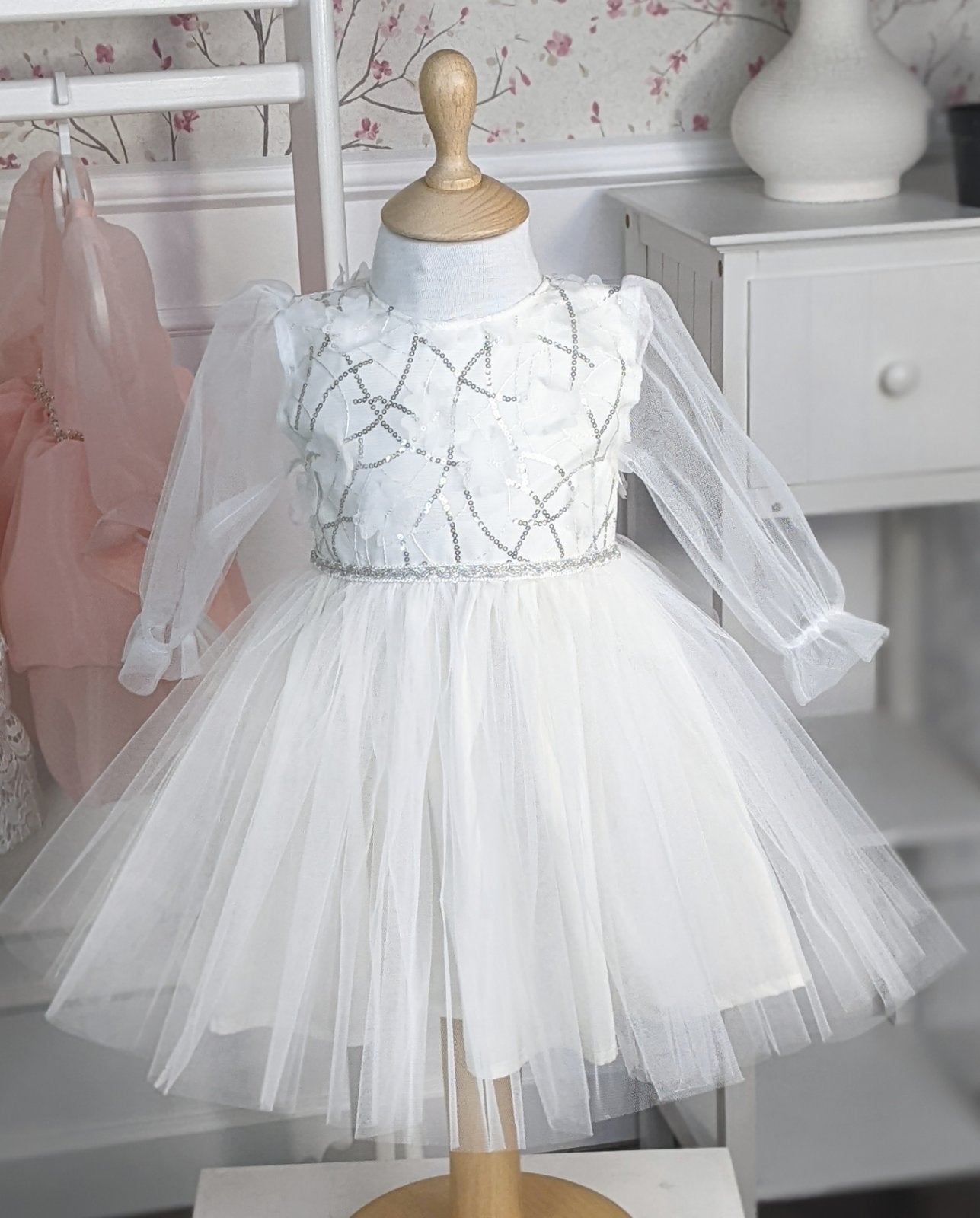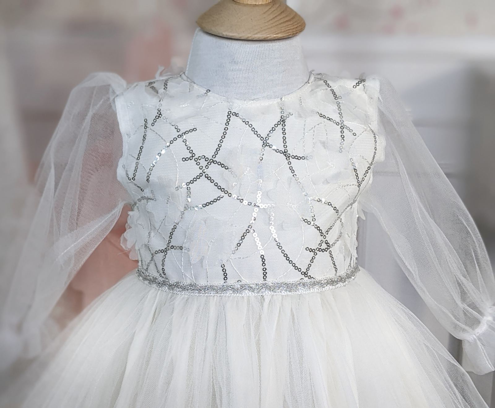 Bela haljina sa prišivenim šljokicama u gornjem delu