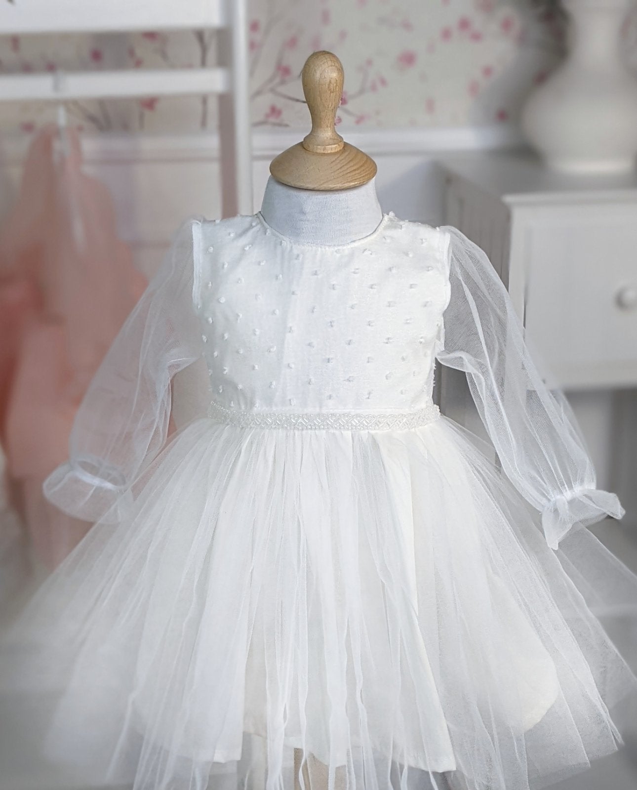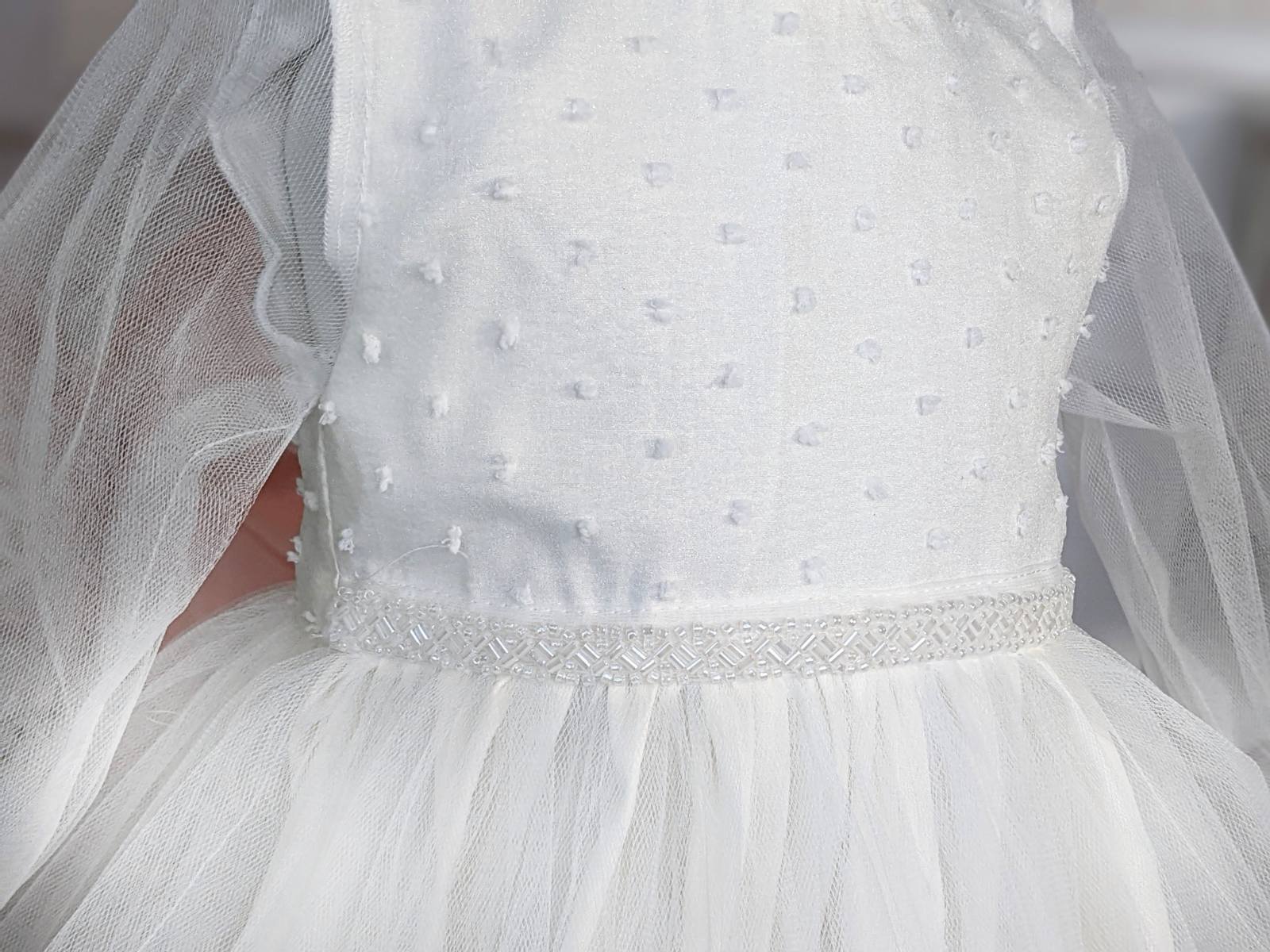 Bela haljina sa tufnama u gornjem delu i biserima na struku