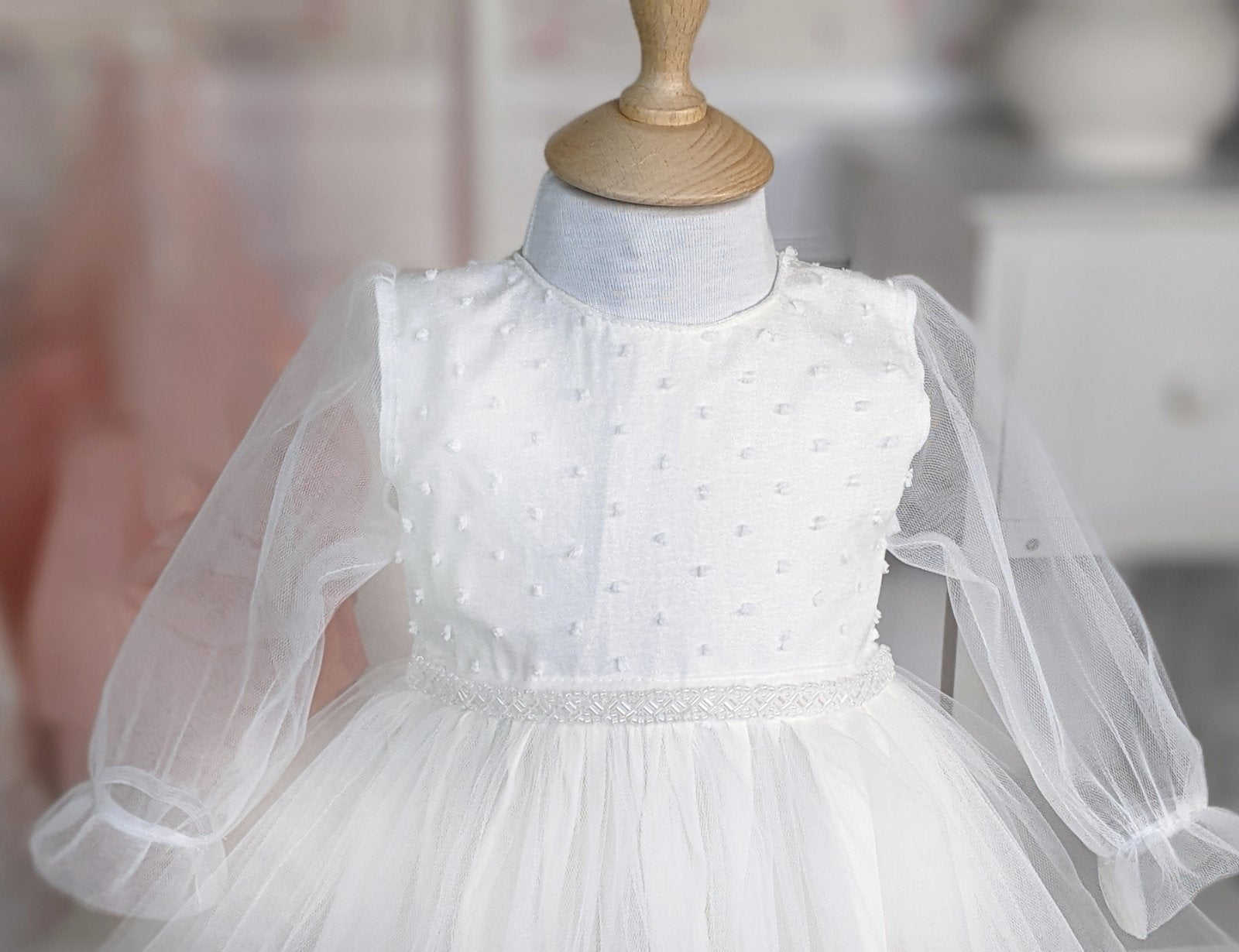 Svečana bela haljina postavljena pamučnim materijalom. Pozadi je dugačak rajfešlus. U prilogu je Vodič za veličine gde možete proveriti obim struka i dužinu haljine i tako izabrati odgovarajući broj. Klikom na izabranu veličinu dobijete cenu za taj broj