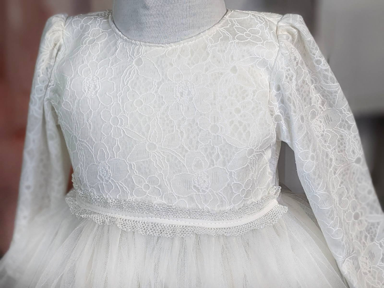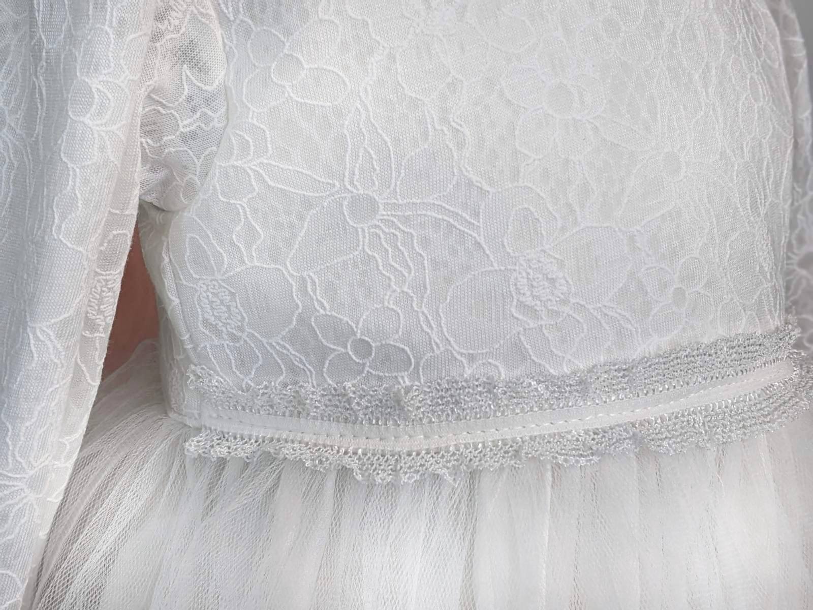 Svečana bela haljina postavljena pamučnim materijalom. Pozadi je dugačak rajfešlus. U prilogu je Vodič za veličine gde možete proveriti obim struka i dužinu haljine i tako izabrati odgovarajući broj. Klikom na izabranu veličinu dobijete cenu za taj broj