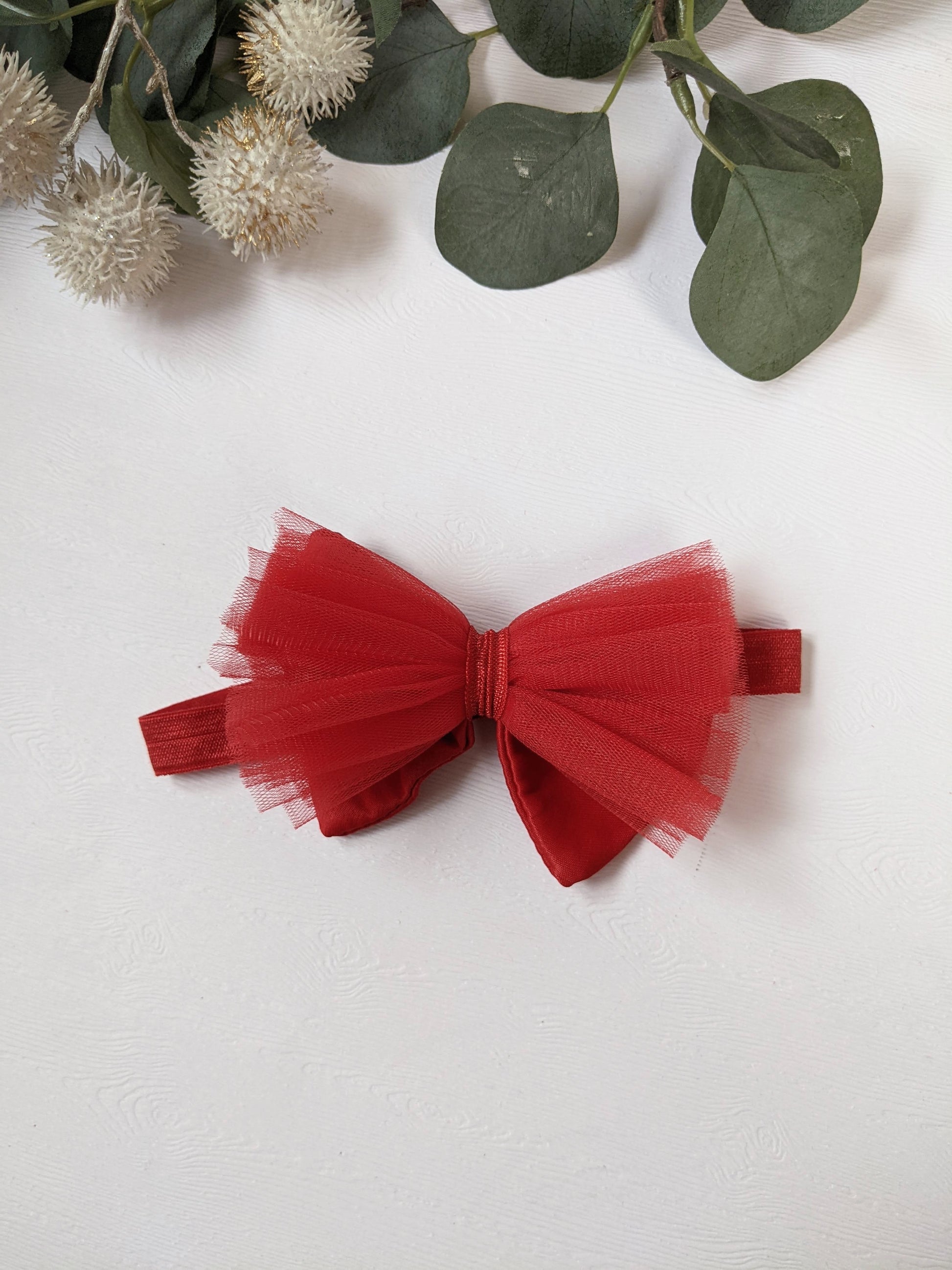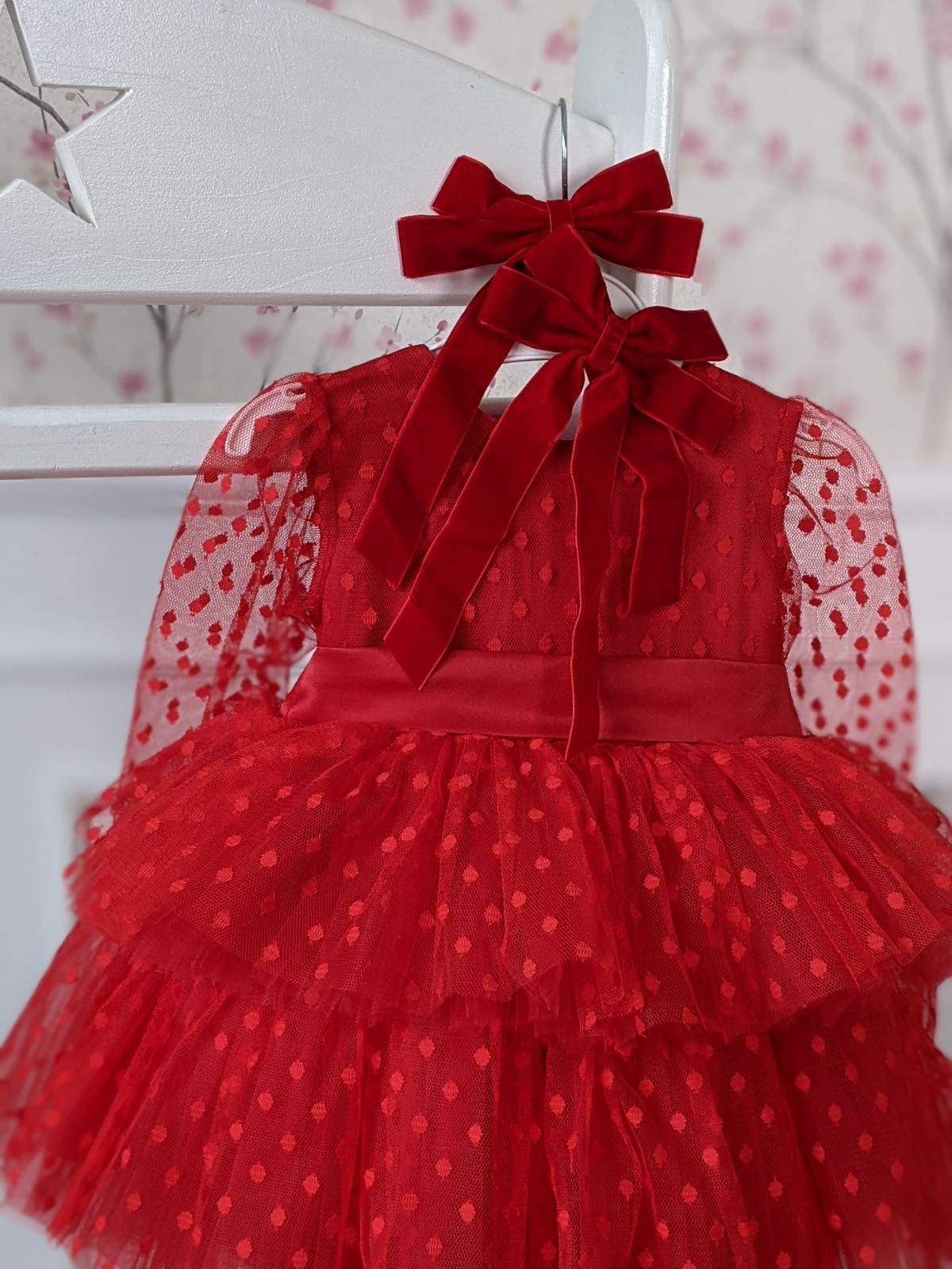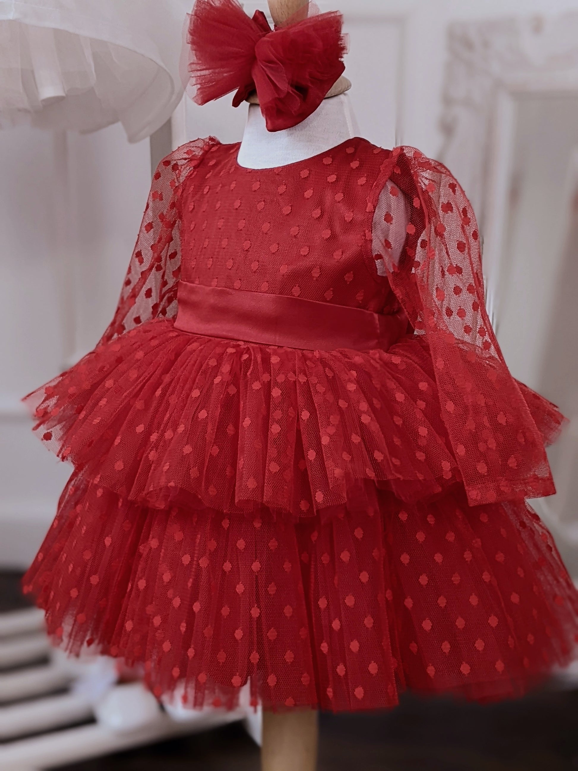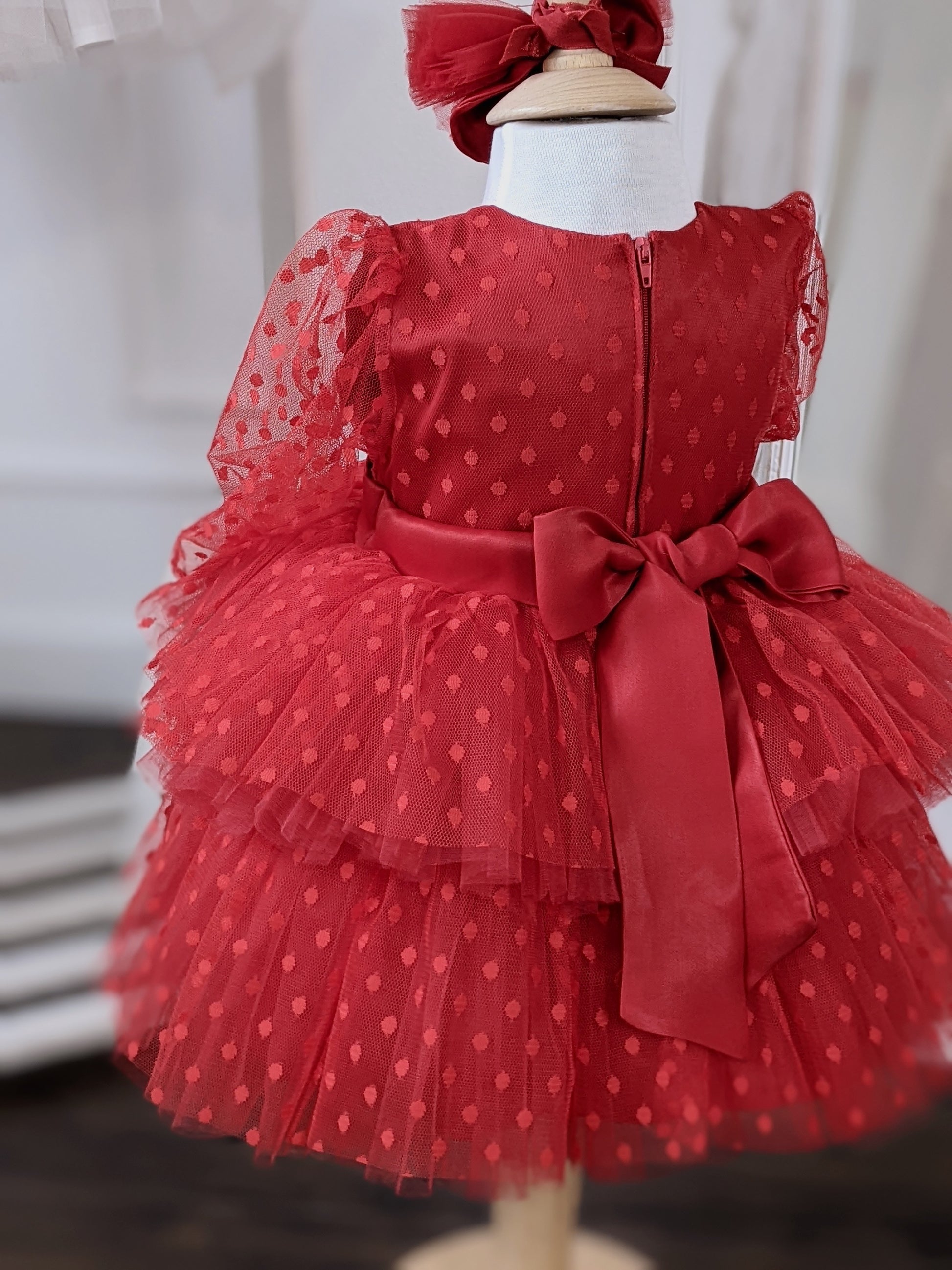 Crvena haljina od tila na tufne sa 2 karnera. Haljina može biti i sa kratkim rukavima. Ispod karnera je debeli sloj tila i pamučna postava. Gornji deo haljine takođe je postavljen pamučnim materijalom. Na struk je našiven pojas koji se pozadi vezuje u mašnu. Pozadi je dugačak rajsferšlus. Rukavi su dugi. Uz haljinu dobijate rastegljivu traku za glavu sa mašnom za manji uzrast ili 2 mašne za kosu za stariji uzrast. U prilogu je Vodič za veličine gde možete proveriti obim struka i dužinu haljine i tako izabrati odgovarajući broj. Klikom na izabranu veličinu dobijete cenu za taj broj.