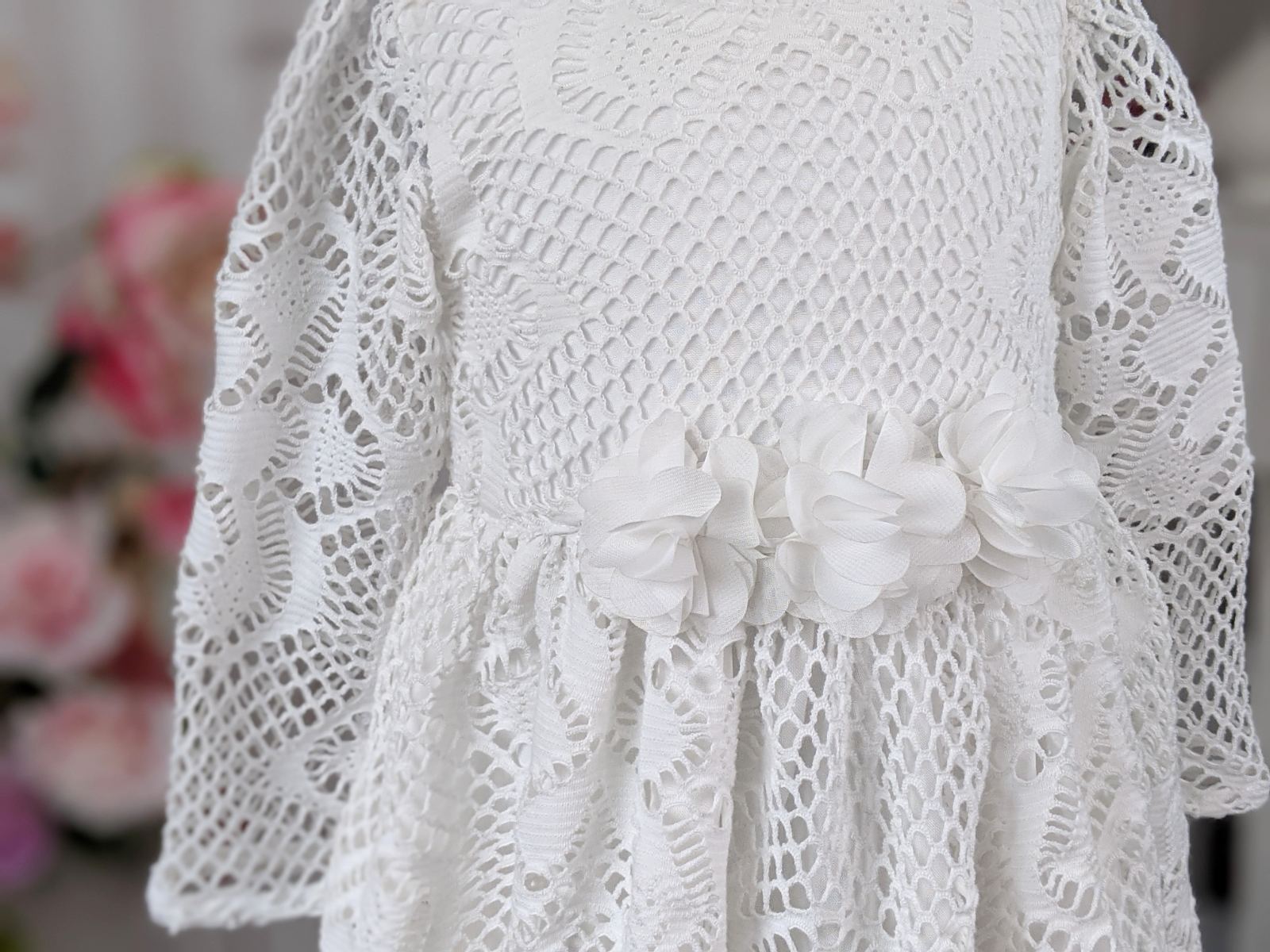 Haljina od bele čipke sa ružama na pojasu