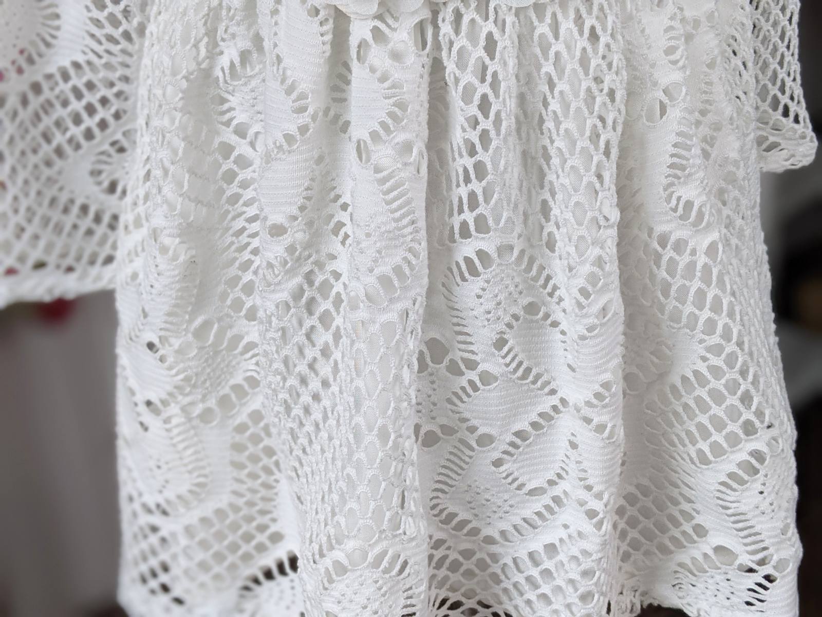 Haljina od bele čipke. Haljina može biti i sa kratkim rukavima. Gornji i donji deo haljine je postavljen pamučnim materijalom. Za sve korekcije možete nam se obratiti putem poruke na društvenim mrežama. Pozadi je dugačak rajfešlus. U prilogu je Vodič za veličine gde možete proveriti obim struka i dužinu haljine i tako izabrati odgovarajući broj. Klikom na izabranu veličinu dobijete cenu za taj broj