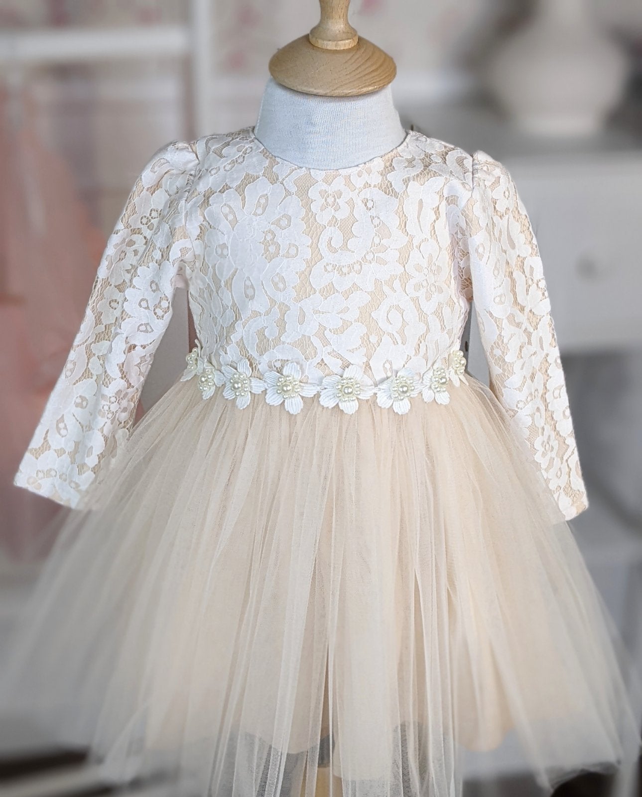 Na pojasu je ušiven red divnih cvetova sa biserima. Pozadi se nalazi dugačak rajfešlus radi lakšeg oblačenja. Ispod čipke je pamučni materijal. U prilogu je Vodič za veličine gde možete proveriti obim struka i dužinu haljine i tako izabrati odgovarajući broj.