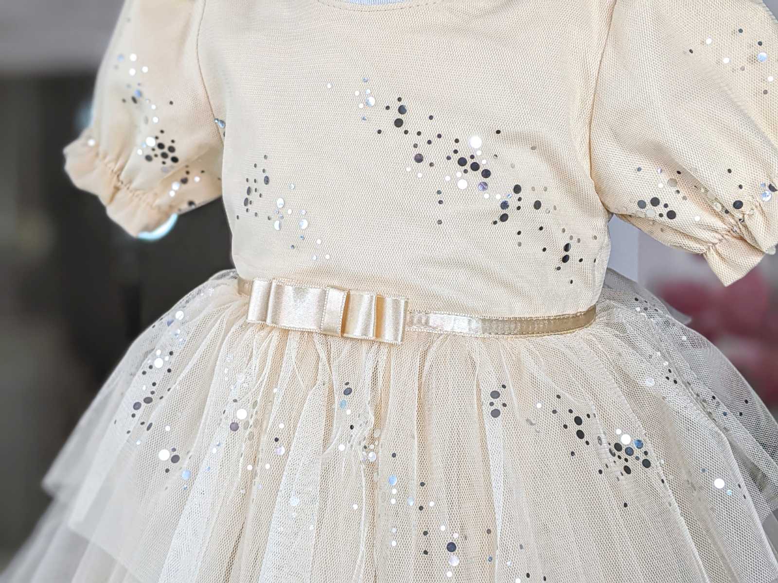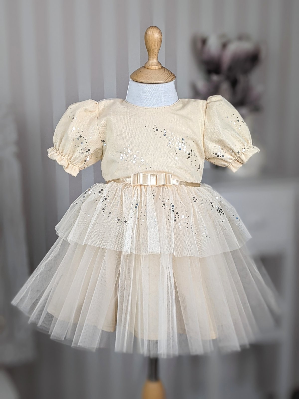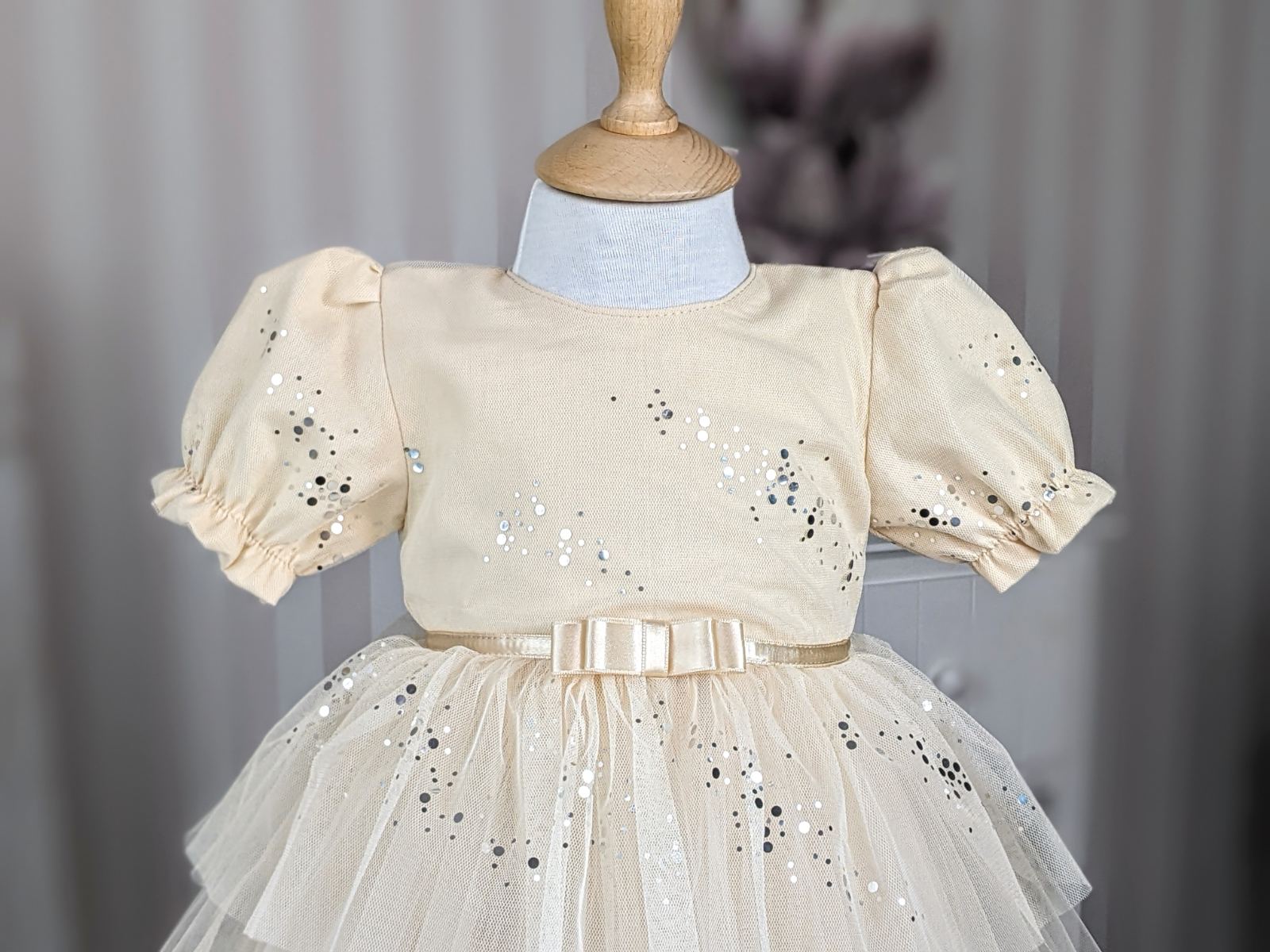 Haljina od bež tila sa svetlucavim detaljima u svim dečjim brojevima. Ispod tila je pamučni materijal. Uz haljinu dobijate i odgovarajuću traku za glavu sa mašnom. Pozadi je dugačak rajfešlus. U prilogu je Vodič za veličine gde možete proveriti obim struka i dužinu haljine i tako izabrati odgovarajući broj. Klikom na izabranu veličinu dobijete cenu za taj broj