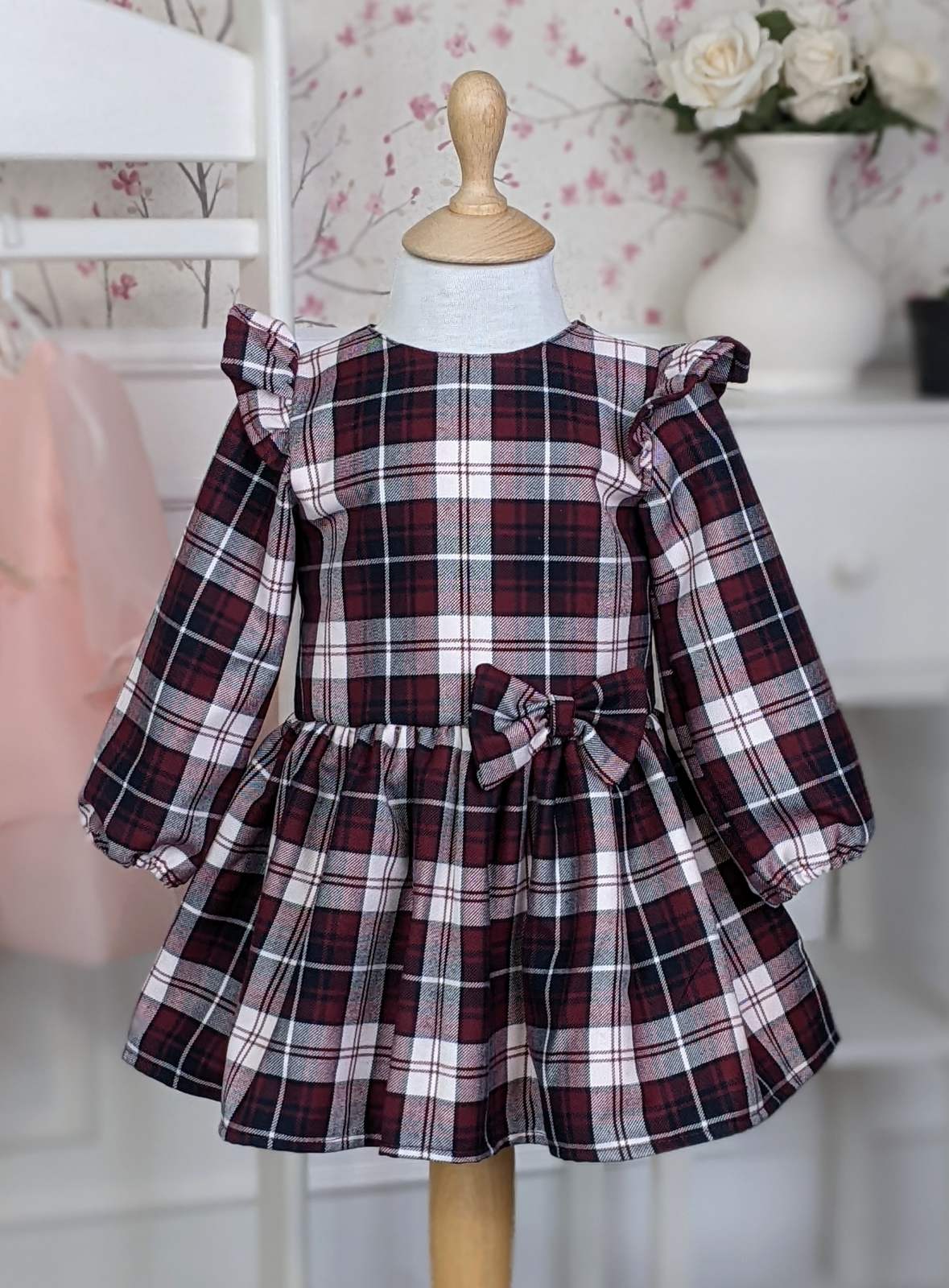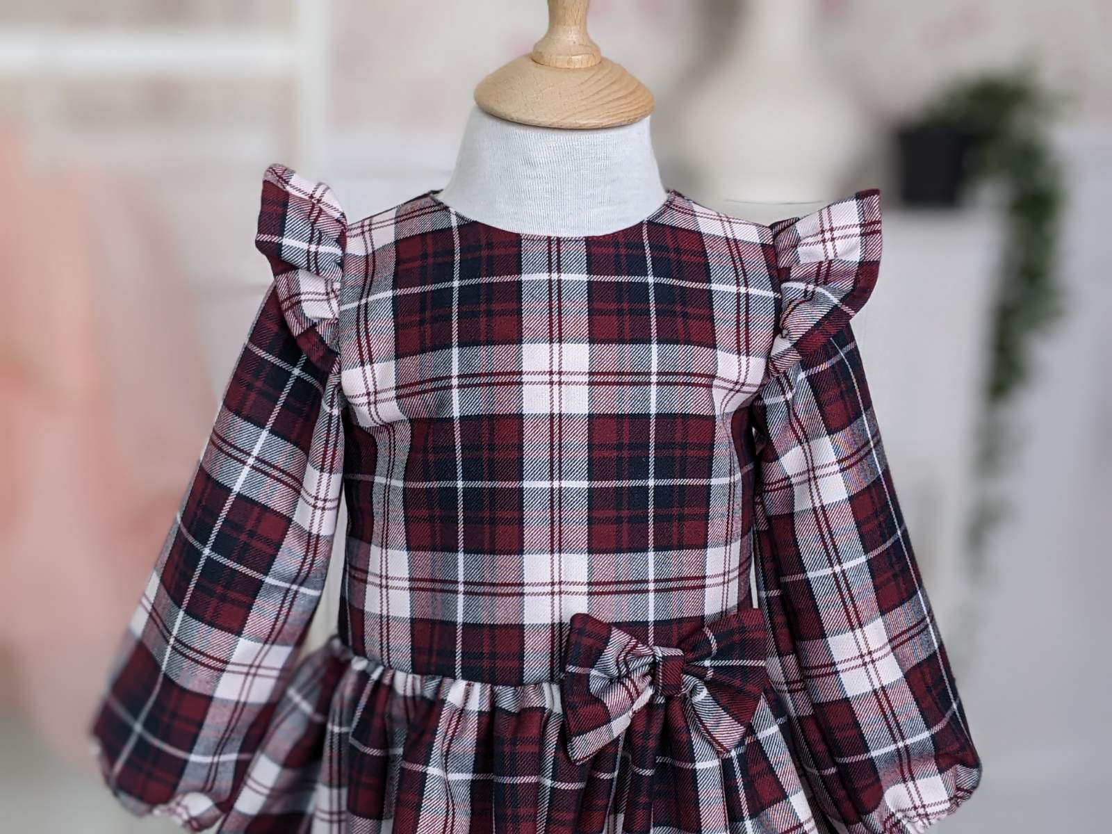 Haljina u klasičnom dezenu škotskog karoa u bordo boji. Uz haljinu dobijate i odgovarajući ukras za kosu. Gornji deo haljine je postavljen pamučnom postavom. Pozadi je dugačak rajsferšlus. U prilogu je Vodič za veličine gde možete proveriti obim struka i dužinu haljine i tako izabrati odgovarajući broj. Klikom na izabranu veličinu dobijete cenu za taj broj.