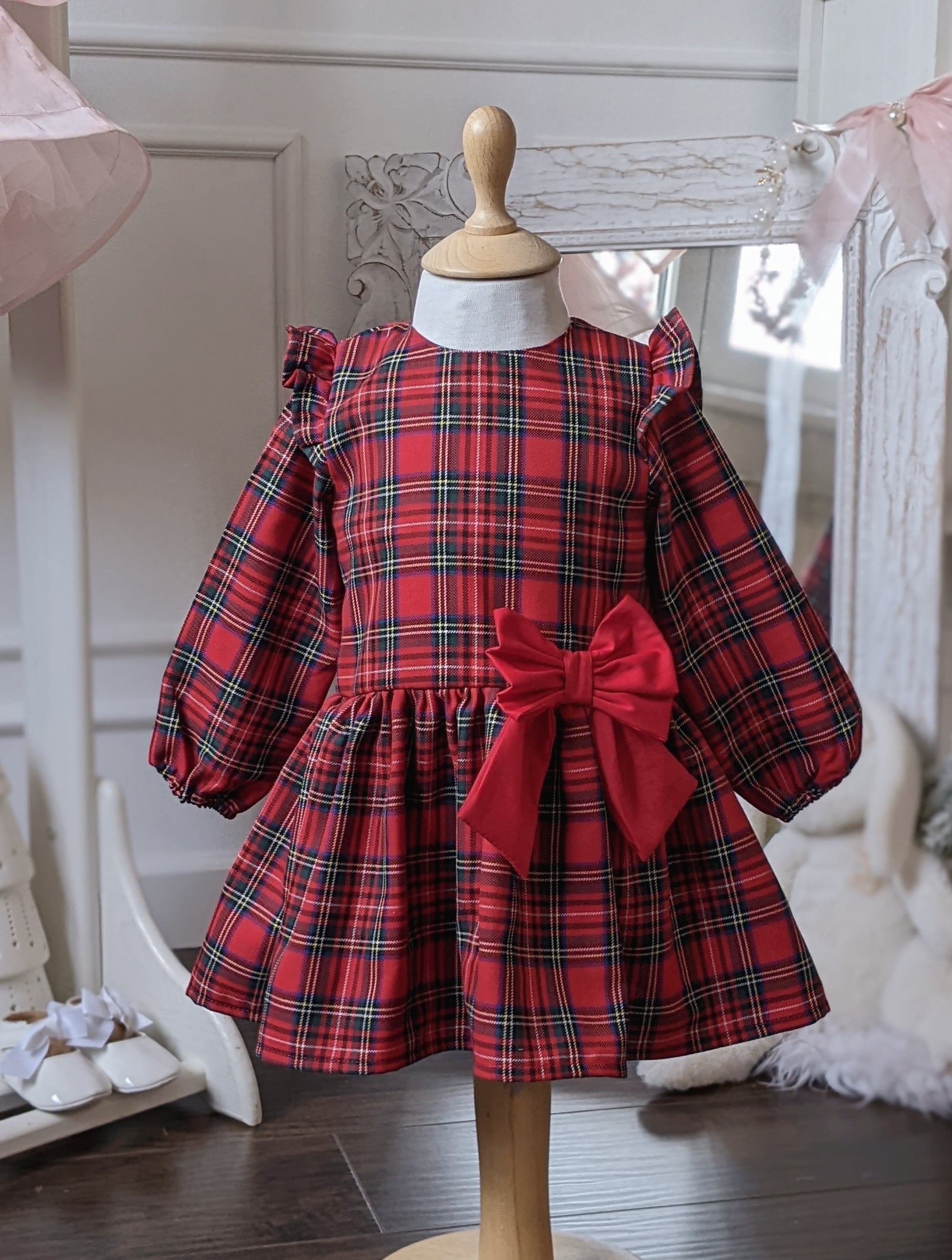 Haljina u klasičnom dezenu škotskog karoa u crvenoj boji. Uz haljinu dobijate i odgovarajući ukras za kosu. Gornji deo haljine je postavljen pamučnom postavom. Pozadi je dugačak rajsferšlus. U prilogu je Vodič za veličine gde možete proveriti obim struka i dužinu haljine i tako izabrati odgovarajući broj. Klikom na izabranu veličinu dobijete cenu za taj broj.