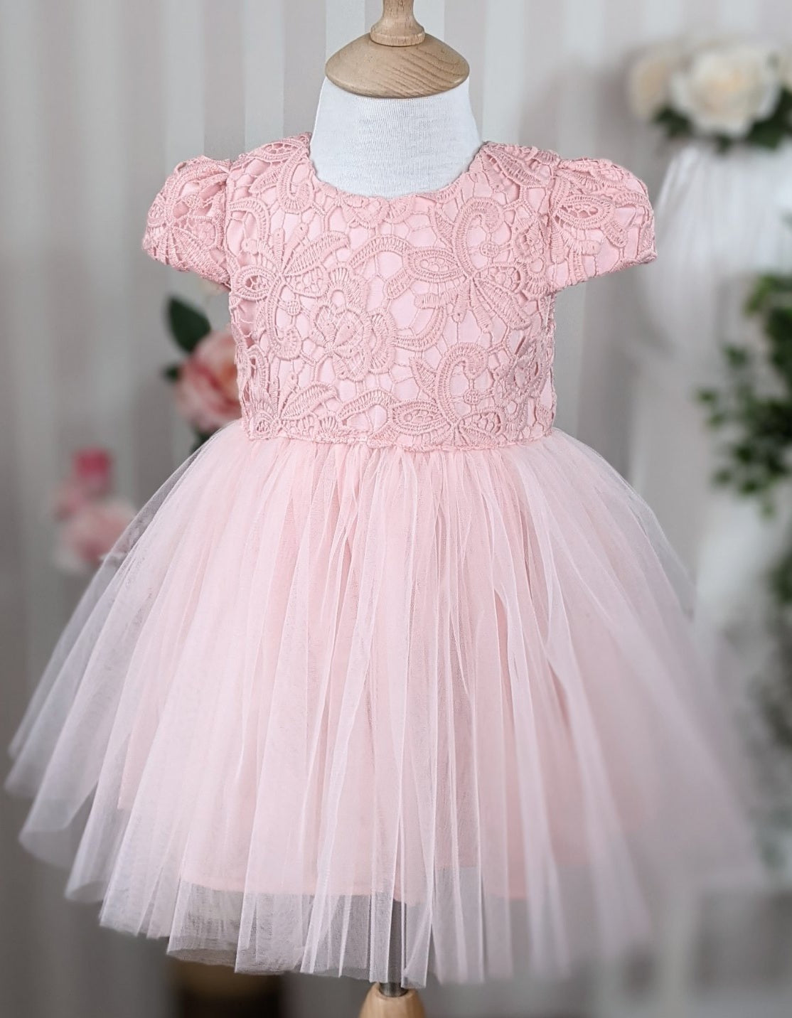 Haljina od roze čipke i tila u svim dečijim veličinama. Pozadi je dugačak rajfešlus. Ispod čipke u gornjem delu haljine i tila u donjem delu haljine je pamučni materijal. U prilogu je Vodič za veličine gde možete proveriti obim struka i dužinu haljine i tako izabrati odgovarajući broj. Klikom na izabranu veličinu dobijete cenu za taj broj