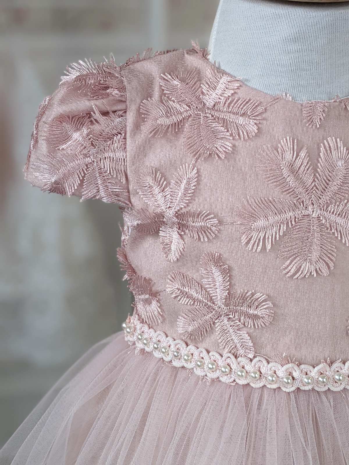 Haljina u prljavo roze boji sa biserima na struku. Bolero se kupuje posebno.Ispod čipke u gornjem delu i ispod tila u donjem delu haljine je pamučni materijal. Pozadi je dugačak rajfešlus. U prilogu je Vodič za veličine gde možete proveriti obim struka i dužinu haljine i tako izabrati odgovarajući broj. Klikom na izabranu veličinu dobijete cenu za taj broj