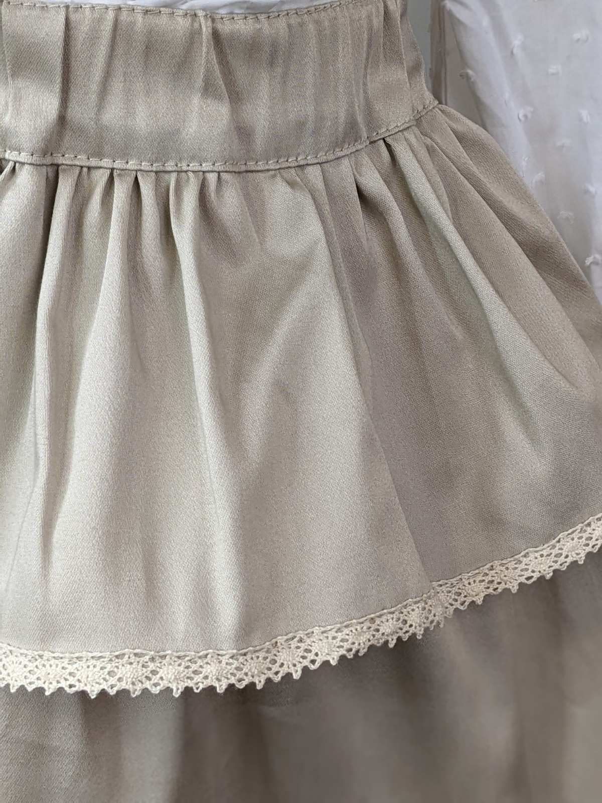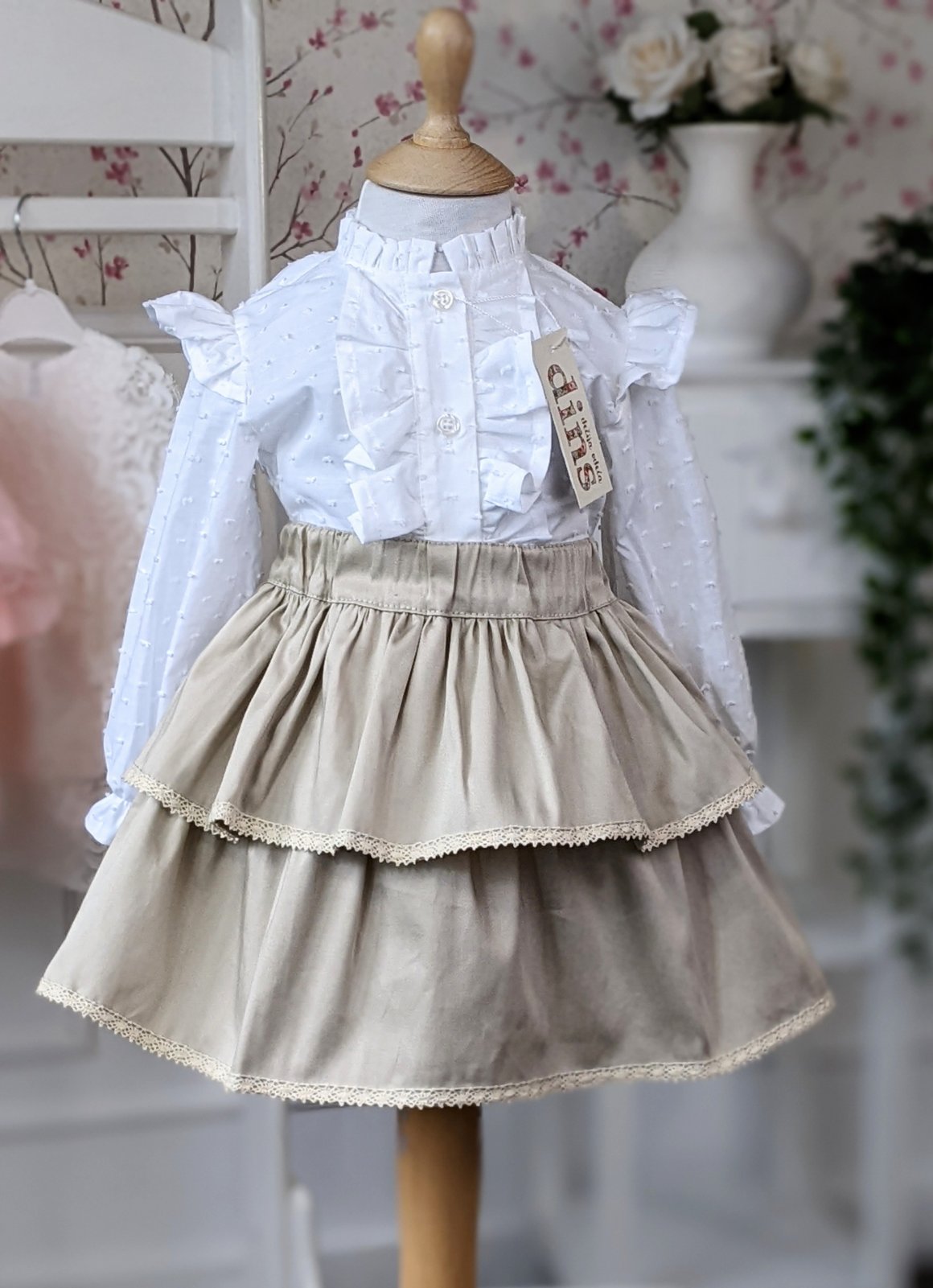 Suknja od bež pamučnog kepera. U struku je guma, pozadi rajsferšlus. Bela košulja se prodaje posebno