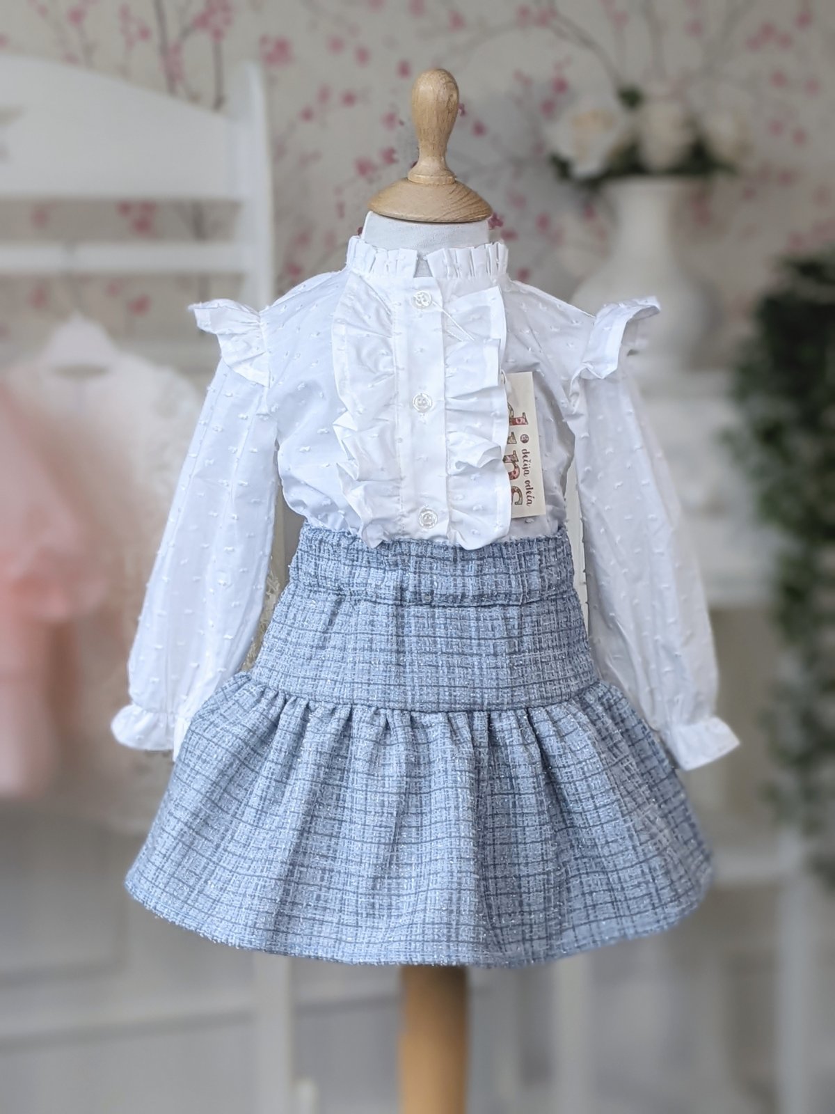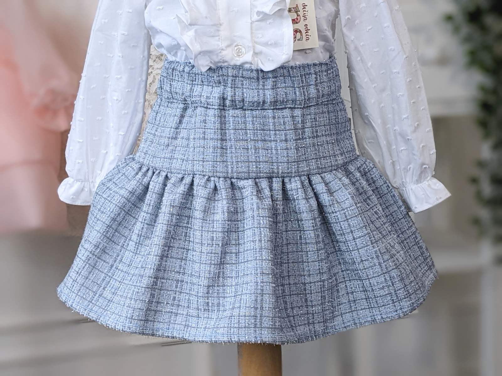 Suknja od plavog buklea sa diskretnim sjajnim nitima . U struku je guma, pozadi rajsferšlus. Bela košulja se prodaje posebno
