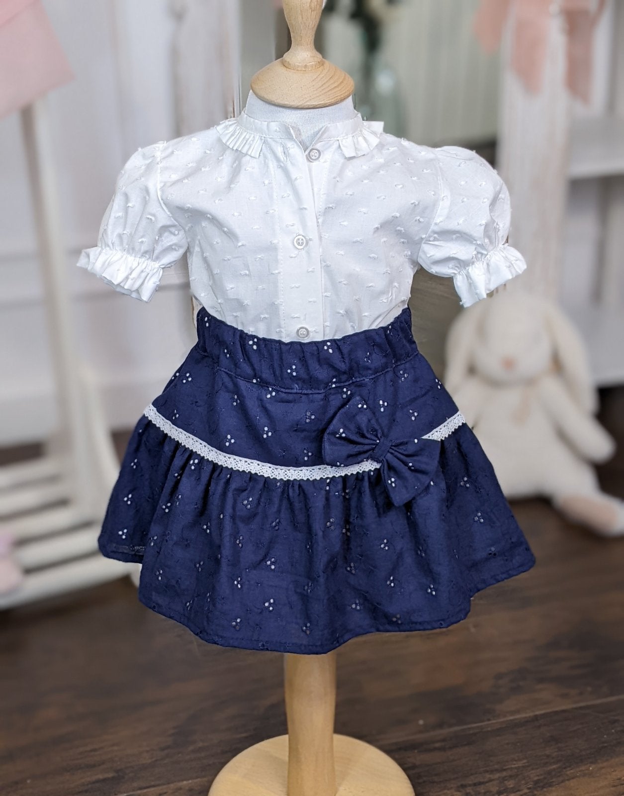 Suknja od tankog pamučnog materila sa vezom. U struku je guma a pozadi rajsferšlus. Bela košulja se prodaje posebno